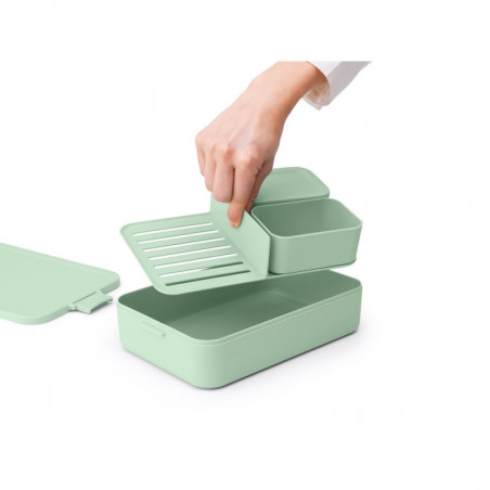 Обичате разнообразието в обяда си? Тогава кутията за обяд с разделители Brabantia Make&Take е перфектният избор за вас. Практичният й дизайн ви позволява лесно да отделите различни храни, като същевременно съхранявате сандвичи, плодове, зеленчуци или ядки в отделни контейнери. Благодарение на разделителите и възможността да ги подредите на две нива, тази кутия ви осигурява удобство и гъвкавост, като същевременно предотвратява смесването на вкусовете. Лесна за почистване в съдомиялна и изработена от безопасен материал без BPA, тя е и екологичен избор за многократна употреба.