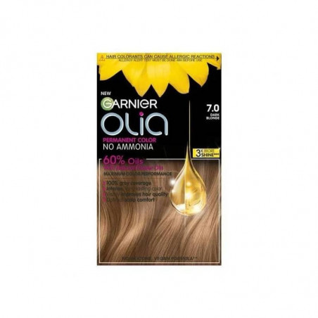Garnier Olia 7.0 е трайна боя за коса, без съдържание на амоняк, базирана на комплекс от 60% концентрирани растителни масла, които не просто подхранват, но и разкриват цвета от сърцевината на косъма. Боята подхранва корените и кожата на главата, съхранява естествената им влага и прави косата блестяща, силна и изпълнена с живот. Уникалната формула на Гарниер Олиа Боя за коса 7.0 съдържа масла от камелия (Camellia), слънчоглед (Sunflower), пасифлора (Passion Flower) и ливадина (Limnanthes Alba). Тези масла са били използвани в продължение на векове за грижа и защита на косъма и скалпа. Продуктът притежава изключителна покривност и наситеност на цвета, като покрива до 100% сивите коси и изсветлява до 3 тона от основния цвят. Кадифено гладката текстура на боята се нанася лесно и не се разтича. Боята подобрява видимо състоянието на косата, оставяйки я блестяща и мека, с невероятно наситен цвят за дълго време. Консистенцията на Olia има деликатен аромат на цветя и щади скалпа.