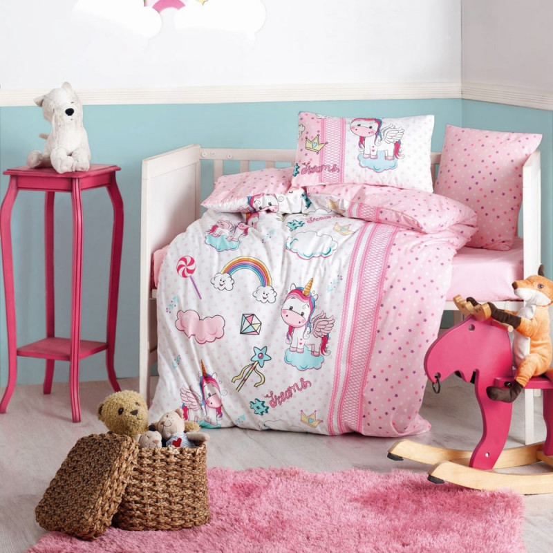 Детски спален комплект Cotton Box 129CTN3020, 4 части, Памук Ranforce, Плик 100х150, Чаршаф 120х150, Розов