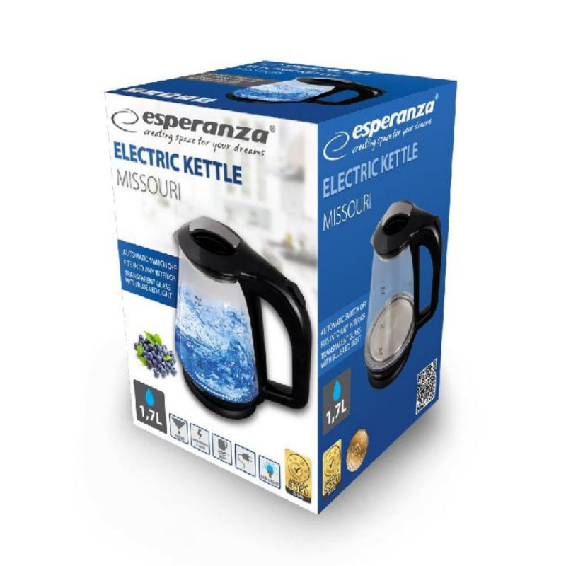 Електрическа кана Esperanza EKK024K, 1500W, 1.7л, Стъклен корпус, LED светлини, Черен