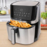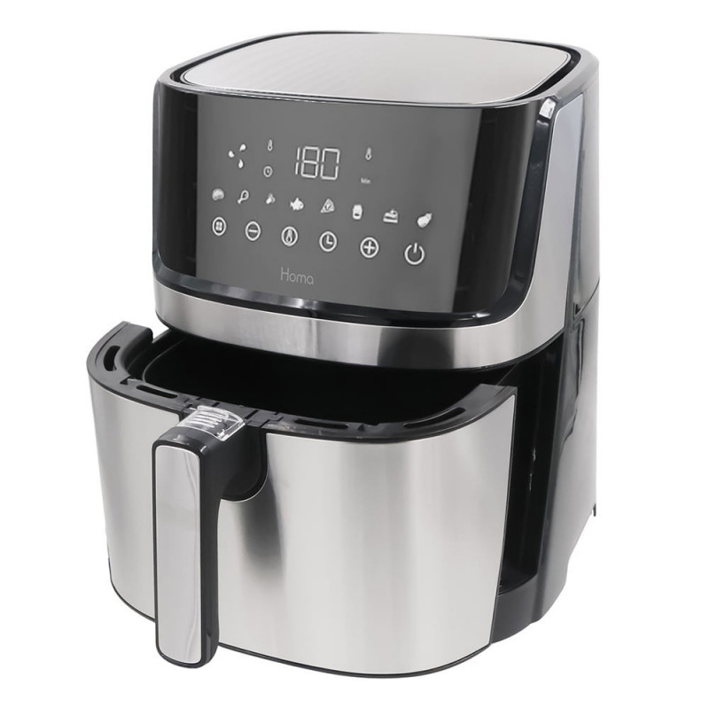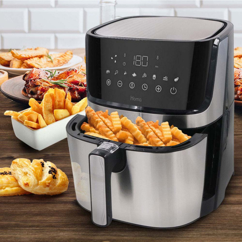 Фритюрник с горещ въздух - Еър Фрайър HOMA с мощност 1700W и капацитет 5 литра. Гответе любимите си ястия, като използвате 8 предварително зададени програми с едно докосване. 8 функции в 1 уред за здравословно хранене и с до 85% по-малко мазнини без силни миризми, които остават в кухнята. Насладете се на същите вкусни, хрупкави текстури и вкус като традиционно пържената храна.  Ястията са готови за по-малко време, отколкото би било необходимо в обикновена фурна, но са по-хрупкави и по-вкусни. Времето за готвене е намалено благодарение на мощния нагревател и вентилатор, който се грижи горещия въздух да минава през ястието и готвенето да е по-ефективно. Полезен уред за ангажирани хора, които искат да си сготвят нещо бързо и вкусно.