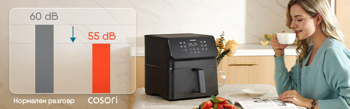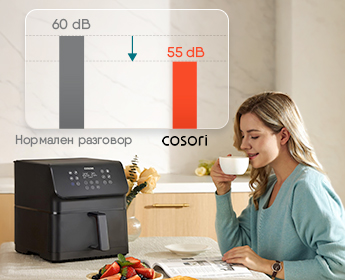 Фритюрник с горещ въздух Cosori Premium II CAF-P651-KEUR, 6.2 л, 11 програми, Таймер, AirWhisper, Черен Приготвяйте вкусни и здравословни ястия за цялото семейство с Cosori Premium II . Новият и усъвършенстван модел съчетава по-голям капацитет от 6.2 литра с елегантен и компактен дизайн. С 11 интуитивни функции за готвене и до 85% по-малко мазнини, вие получавате перфектна хрупкавост без компромис със здравето. Кошница с голям капацитет С капацитет от 6.2 л и квадратен дизайн, кошницата на Premium Ⅱ ви позволява да приготвите вкусна и здравословна храна за цялото семейство. 11 функции за готвене С двойни нагревателни елементи (горен и долен) и температура до 220°C, CAF-R121-KEU гарантира равномерно приготвена храна без усилия. Уникален вкус без излишни мазнини 360-градусовата циркулация на топлина осигурява съвършена хрупкавост, а автоматичното напомняне за разклащане гарантира равномерно приготвени резултати всеки път. Изключително тих Технологията Air Whisper позволява на уреда да готви
