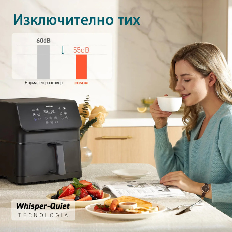с ниво на шум не по-високо от 55 децибела - същото ниво като при лек дъжд. Бързо и лесно почистване Незалепващото покритие на кошницата я прави изключително лесна за почистване. Кошницата е подходяща за съдомиялна машина и е изработена от висококачествени материали без PFOA и BPA . - Мощност: 1700 W - Пържене с горещ въздух 360° циркулация - 1 кошница с капацитет 6.2 литра - Капацитет храна: 2.3 Kg - Дигитален контролен панел - 11 програми за готвене - Температурен спектър на потока: 0° - 205°C - Материал корпус: Полипропилен - Защитни функции: Автоматично изключване Защита против прегряване Антихлъзгаща се основа - Таймер - Термостат - Air Whisper технология: Готвене с не повече от 55 dB - Кошници подходящи за съдомиялна - Висококачествени материал на кошниците без PFOA и BPA - Мрежово захранване - Размери (Д х Ш х В): 37.2 х 32.1 х 30 см - Тегло: 5.72 Kg - Цвят: Черен