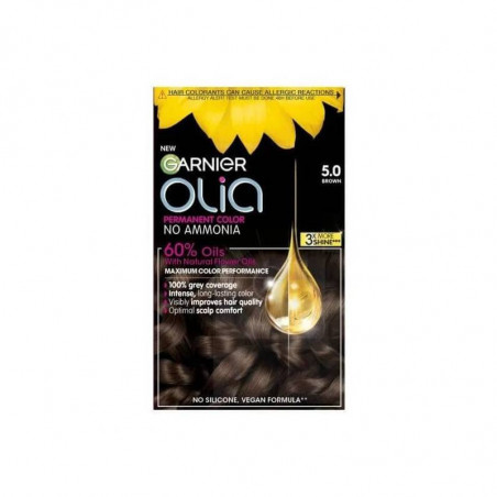 Garnier Olia 5.0 е трайна боя за коса, без съдържание на амоняк, основана на комплекс от 60% концентрирани растителни масла. Тези масла не само подхранват, но и разкриват цвета от сърцевината на косъма. Боята подхранва корените и кожата на главата, съхранявайки естествената им влага, и прави косата блестяща, силна и изпълнена с живот