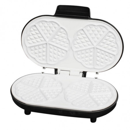 Уредът разполага с двойна гофретна плоча с керамично покритие, което гарантира лесно почистване и предпазва от залепване. Плочите могат да приготвят 2 големи или 10 малки (във формата на сърца) гофрети едновременно.