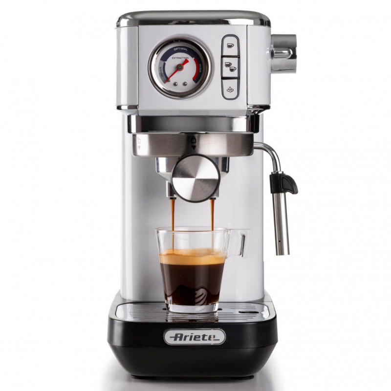 Оборудвана с уред Maxi-Cappuccino, машината създава гъста млечна пяна за кремообразно капучино. Вграден манометър ви помага да следите процеса на екстракция и да постигнете оптимален баланс на водата, кафето и налягането. Освен кафе напитки, Espresso Slim Moderna разполага с диспенсър за гореща вода, идеален за приготвяне на чайове и билкови инфузии.