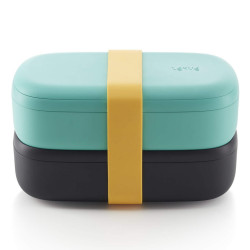 Комплект от 2 контейнера, създадени за съхранение и пренасяне на една порция домашно приготвена храна. Кутиите са свързани със силиконова лента за по-лесно и сигурно транспортиране. Разполагат със 100% херметическо затваряне и вграден клапан на капака, който позволява безопасна употреба в микровълнова печка. Уникалният дизайн включва специално обособена горна част за съхранение на прибори, която ги поддържа чисти и подредени (приборите не са включени, предлагат се отделно с артикулен номер 1010231). Подходящо решение за намаляване употребата на преработени храни и съдове за еднократна употреба. Изработени от полипропилен и устойчиви на широк температурен диапазон.