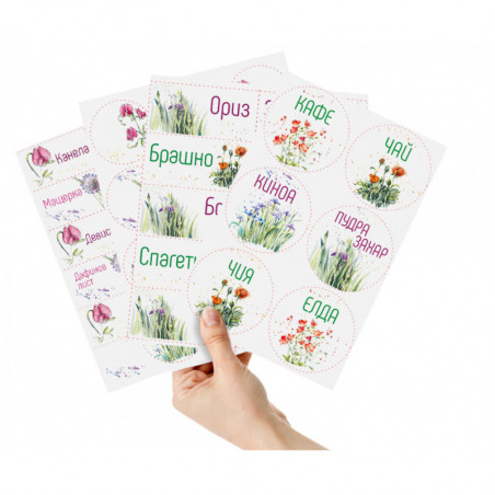 Комплект от 48 стикера, вдъхновени от градинските цветя, с които да организирате подправките и храните в кухнята.