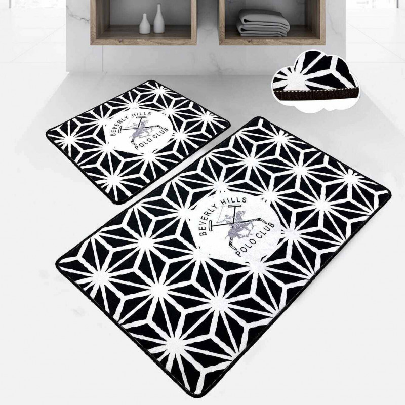 Комплект килими за баня Beverly Hills Polo Club 587BHP2107, 2 части, 100% кадифена тъкан, Антибактериален, Черен/бял