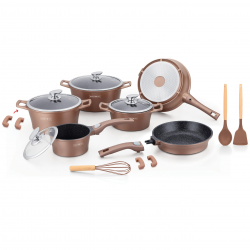 Комплект от кухненски съдове, създаден за удобно и безопасно готвене върху всички видове котлони, включително газови, електрически, индукционни, керамични и халогенни. Подходящ е и за използване във фурна до 230°C, както и в микровълнова печка. Съдовете са изработени от лят алуминий с незалепващо мраморно покритие без PFOA, което осигурява лесно готвене и почистване. Закалените стъклени капаци позволяват наблюдение на процеса на готвене, а свалящите се дръжки с Cool touch гарантират безопасност и удобство при работа.