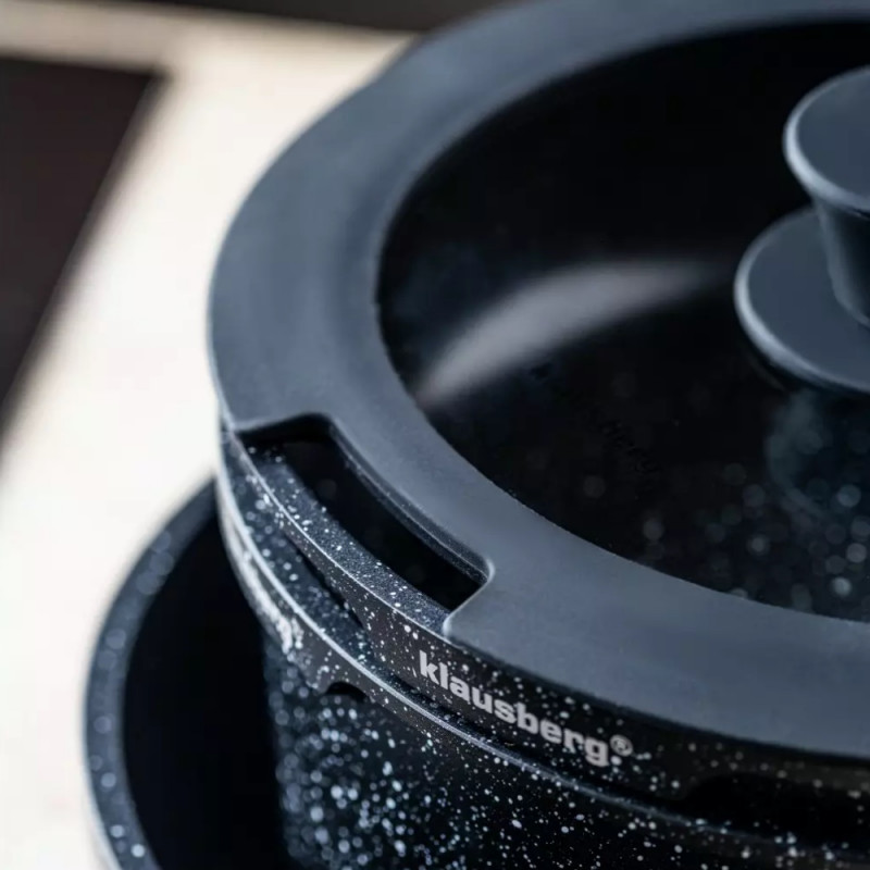 • Комплект съдове за готвене Klausberg KB 7858, 5 части, Стъклен капак, Универсална дръжка, Мраморно покритие, Индукция, Черен