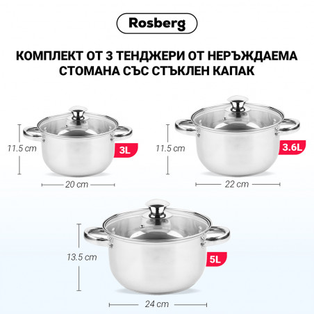 Комплект тенджери Rosberg R51210O6, 6 части, 3-5 L, Стъклен капак, Инокс