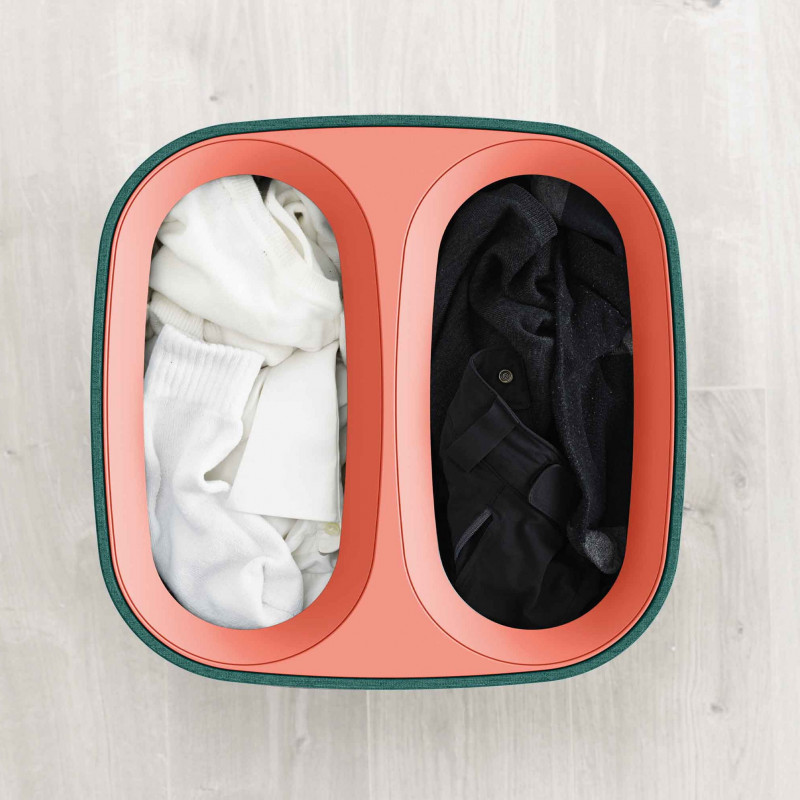 Този удобен кош за пране има две отделения, които ви позволяват да разделите светлите и тъмните дрехи лесно. Идеален е за спални, бани или мокри помещения. Кошът е плоско опакован и включва пълни инструкции за монтаж.