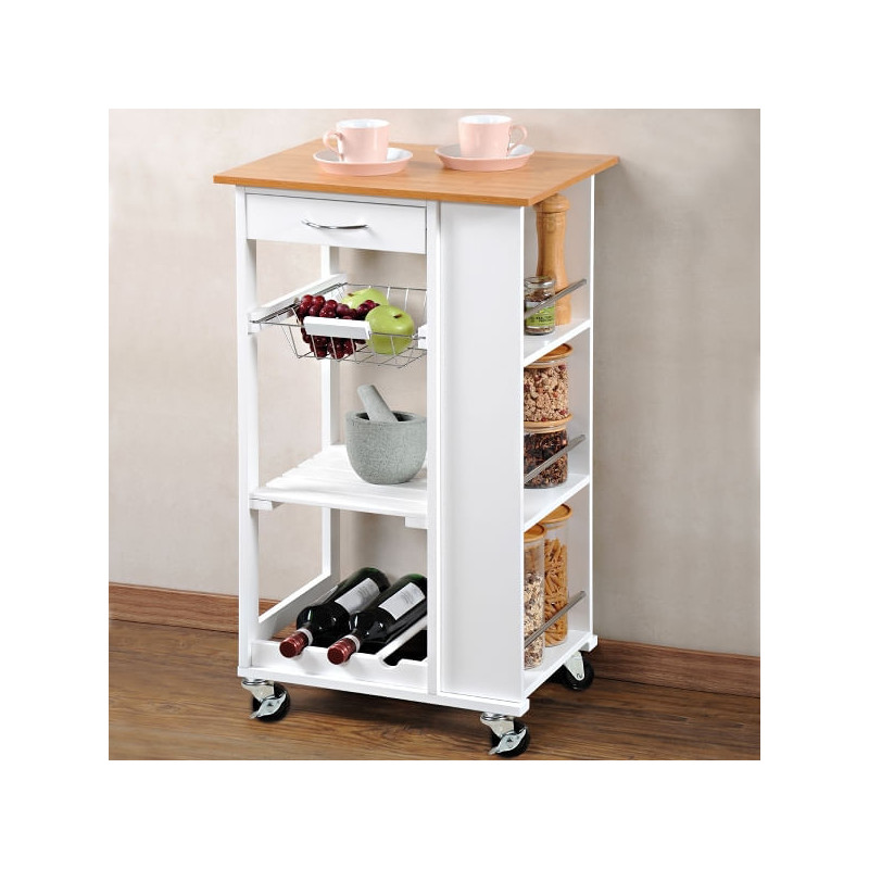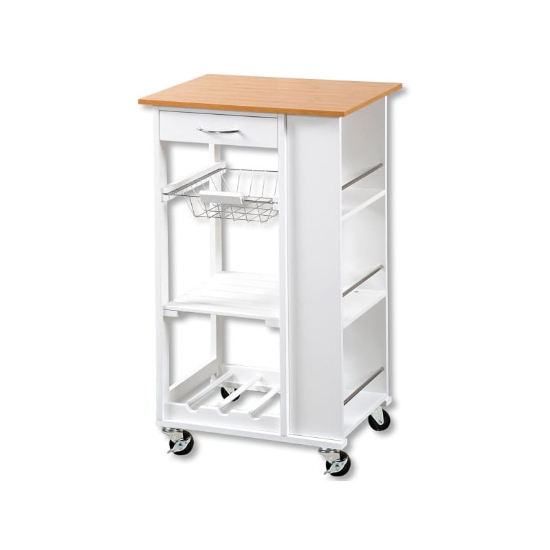 Кухненската количка KESPER® е създадена, за да направи работата в кухнята още по-приятна. Издърпваща се кошница, удобен работен плот, три гнезда за бутилки и едно чекмедже ви гарантират, че имате всичко необходимо под ръка, а освен това спестявате място, което ви дава повече свобода на движение в кухнята. Количката е оборудвана с 4 напълно подвижни колела, което означава че можете винаги да я преместите лесно и бързо, както и да я паркирате безопасно на място, благодарение на двете спирачки. В резултат на това вашата кухненска количка никога не ви пречи, напротив - винаги е там, където е необходима.