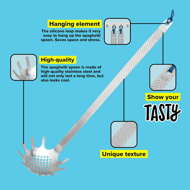 Идеална е за сервиране на спагети или юфка, а излишната вода от готвенето просто изтича благодарение на дупките в средата на лъжицата. Дръжката е удобна за хващане и може да се закачи със силиконова примка.