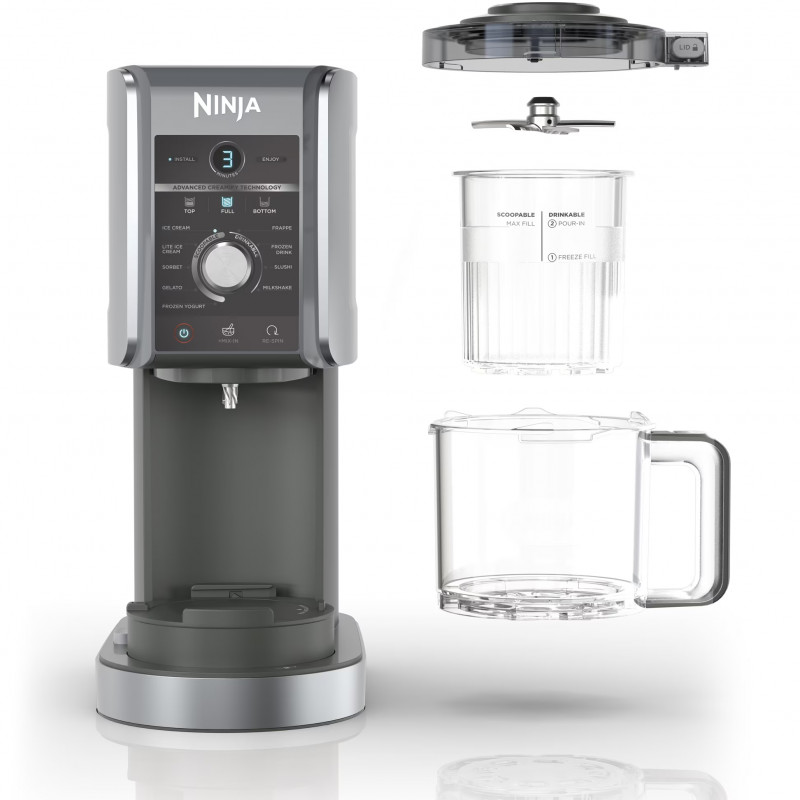- Технология CREAMify: Двойните задвижващи двигатели прилагат натиск надолу и въртят професионалното острие за сметана, което фино нарязва ледените частици и ги превръща във вкусни лакомства като каша, замразени напитки, фрапе и други