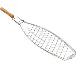 Метална скара за барбекю за риба, Дървена дръжка, 69 х 15 см, Инокс