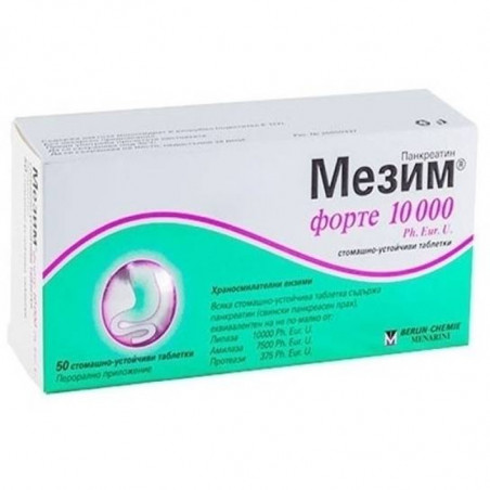 - Мезим® форте 10000 Ph. Eur. U, е лекарство, съдържащо вещества (ензими) от свински панкреас (панкреасен прах, наричан още панкреатин), които подпомагат храносмилането