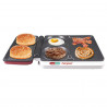 Тя е оборудвана с гладка плоча, която е идеална за приготвяне на месо, риба, зеленчуци и хляб. Оребрената кръгла плоча е перфектна за приготвяне на вкусни бургери, докато гладката кръгла плоча е идеална за печене на яйца. Оребрената повърхност може да се разшири, като отворите горната плоча на 180 градуса, което ви позволява да се наслаждавате на още по-голяма готварска повърхност.