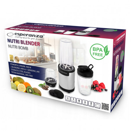 Освен това, нутри блендерът Esperanza EKM030 е безопасен за здравето, тъй като е изработен от безопасни материали, които не съдържат BPA. Дизайнът на блендера е модерен и елегантен, като е изработен от инокс и черен цвят.