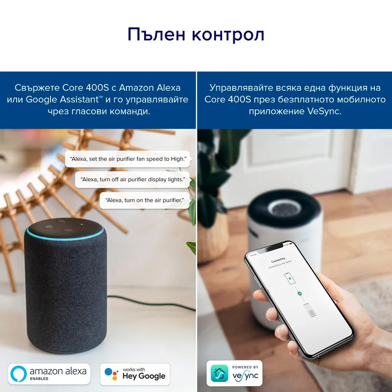 Свържете Core 400S с Amazon Alexa или Google Assistant™ и го управлявайте чрез гласови команди от всяко кътче на дома си.