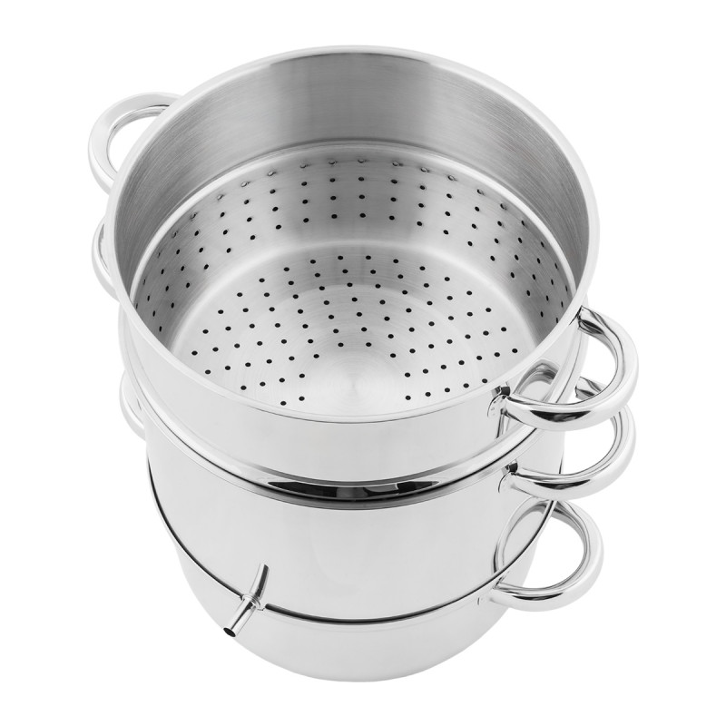 Соковарката от неръждаема стомана GS-01201-26JS-1 с оптимален обем от 8 литра е подходяща за приготвяне на сокове от плодове, зеленчуци и билки, както и на желе и ликьор. Извлича напълно хранителните вещества и фибри