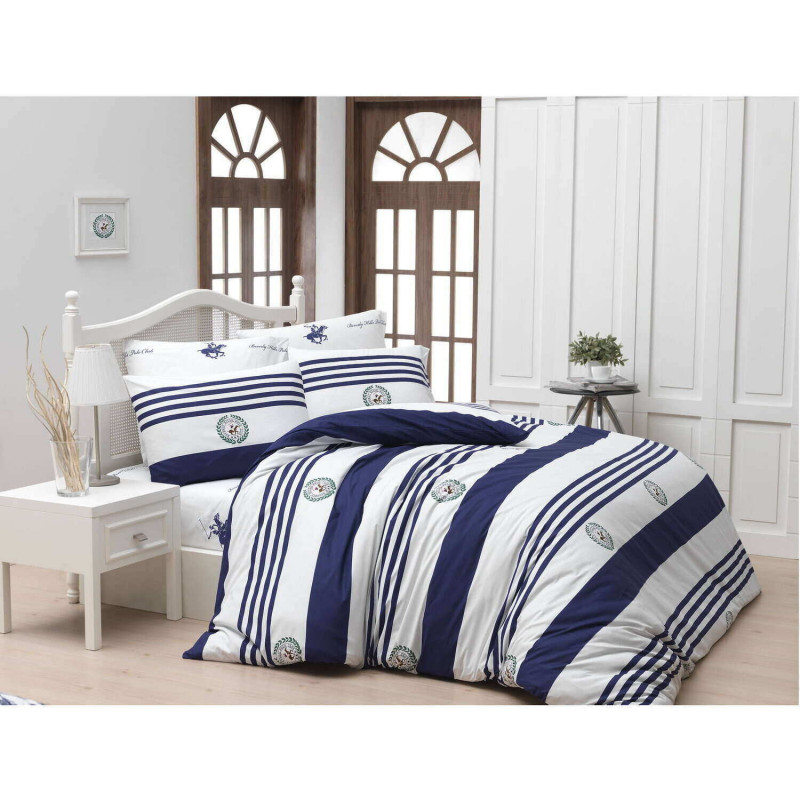 Спално бельо Beverly Hills Polo Club 176BHP2103, 100% памук, Ranforce, 3 части, Плик 160х220см, Чаршаф 160х240см, 1 Калъфка, Тъмно син/Бял
