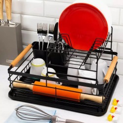 Сушилникът е в стилен черен цвят, който придава приятен вид на кухнята ви. Неговият минималистичен дизайн го прави лесно вписващ се в различни интериорни стилове. Продуктът разполага с две нива, които ви позволяват да подредите съдове и прибори по оптимален начин, без да заемат много място. Така ще имате достатъчно пространство за сушене на големи количества посуда. Оборудван с удобна поставка за прибори, където можете да подредите лъжици, вилици, ножове и други малки кухненски инструменти. Това ви позволява да ги подсушите ефективно и да ги съхранявате на удобно място.
