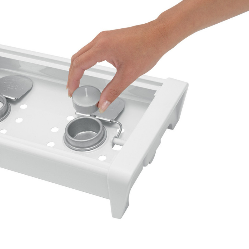 - Безопасна работа със стандартни чаени свещи и запазва храната топла благодарение на бързо и равномерно нагряващата му се алуминиева решетка