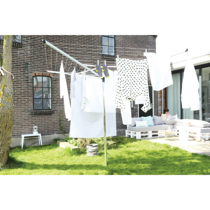 - Вече няма нужда да се обикаля с коша за пране: раменете на простора се въртят лесно и плавно, дори когато са напълно заредени с мокро пране